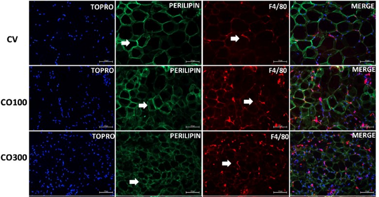 Imagem microscópica do tecido adiposo branco dos camundongos controle (CV) e os suplementados com óleo de coco em duas doses diferentes (CO100 e CO300). Em azul a marcação identificando núcleo celular (TROPO), em verde a marcação da perilipina marcando a célula adiposa e em vermelho a marcação (F4/80) que indica o aumento da presença de macrófagos no tecido adiposo.