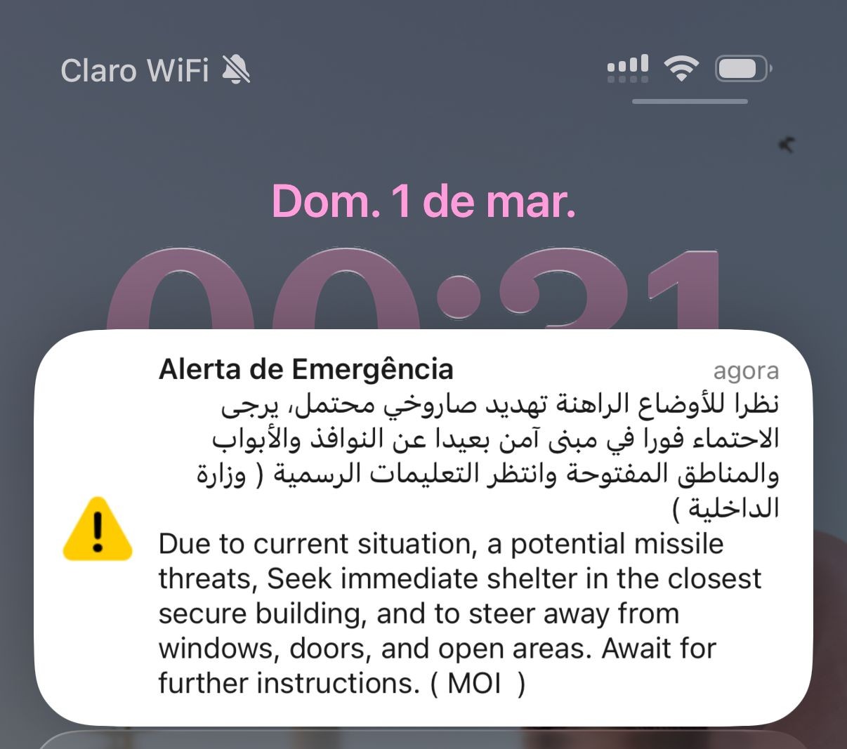 “O alerta é emitido pelo celular com um barulho muito alto. Estávamos com três aparelhos e smartwatches, e todos dispararam ao mesmo tempo. É algo muito assustador, até porque não estamos habituados com um cenário de guerra.” A mensagem orientava a procurar abrigo imediatamente por ameaça de ataque com míssil (veja abaixo).
